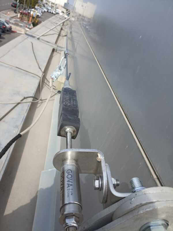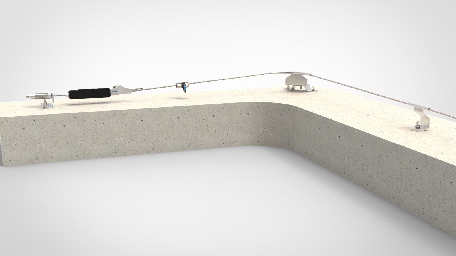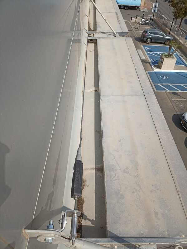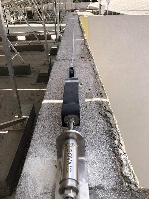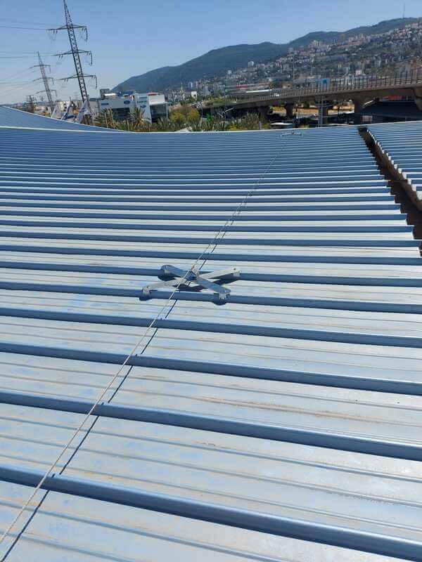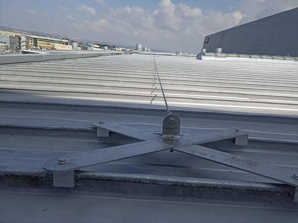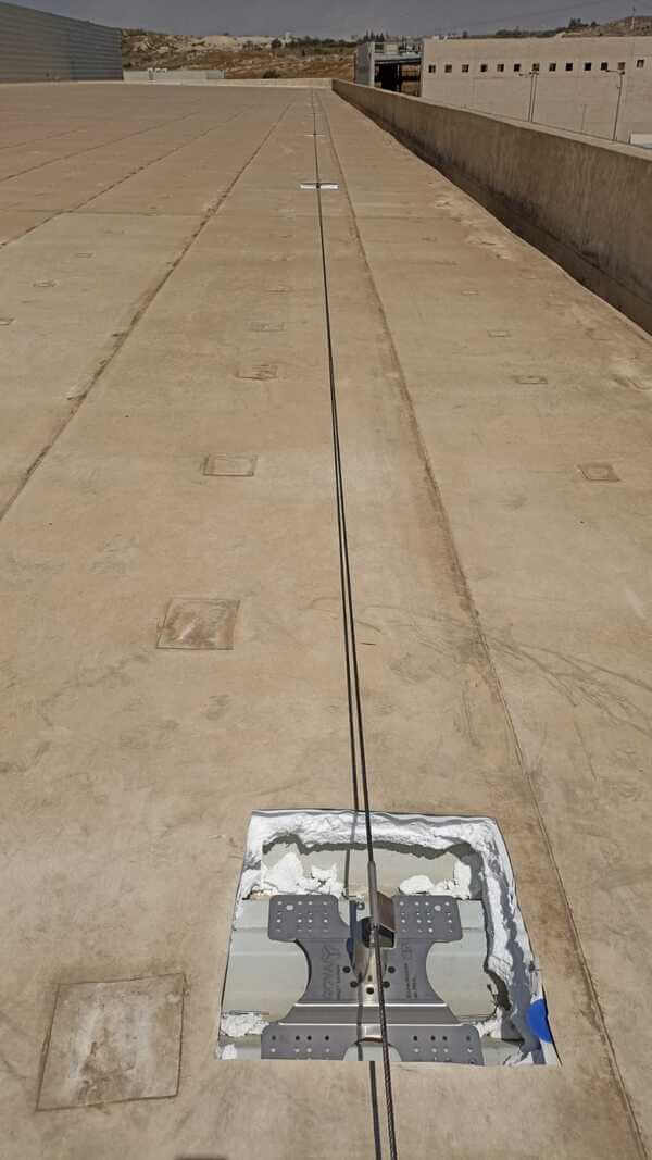 The lifeline system consists of anchor points bolted to the roof surface, an 8 mm thick steel cable, and trolleys that allow the movement of one or more individuals along the line. The anchors have been tested under the most stringent laboratory conditions in the world and have been found to withstand particularly high loads.